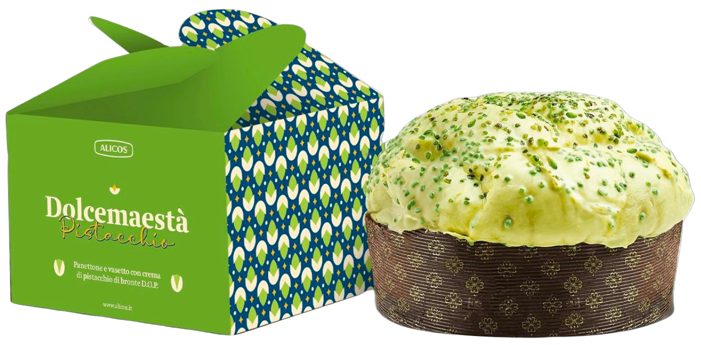 Vous pourrez déguster le panettone, accompagné de chaque part d'une exquise crème de Pistacchio di Bronte AOP.